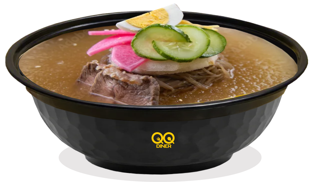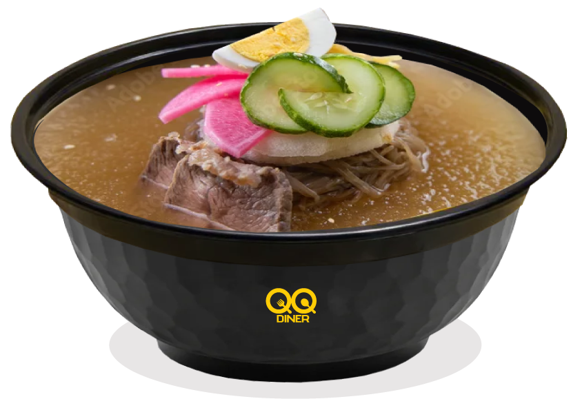 Water cold noodles served in a clear, icy, and tangy broth, often a mix of beef and dongchimi (radish water kimchi) broth.
